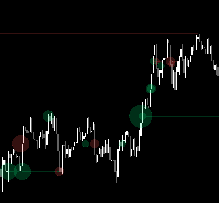 The Orderflow Bubble Engine reveals where the most aggressive trading occurred inside each candle using footprint data. It identifies the row with the strongest delta or tick volume and visualizes it with a dynamic bubble at the exact price level. Key levels extend forward until revisited, exposing where liquidity and participation concentrated.
